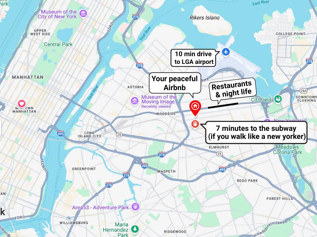 Location: For security reasons, the exact address will be shared after your reservation is confirmed. The property is conveniently located about 4 blocks from the 7 Train — Jackson Heights–Roosevelt Ave Station, Queens.